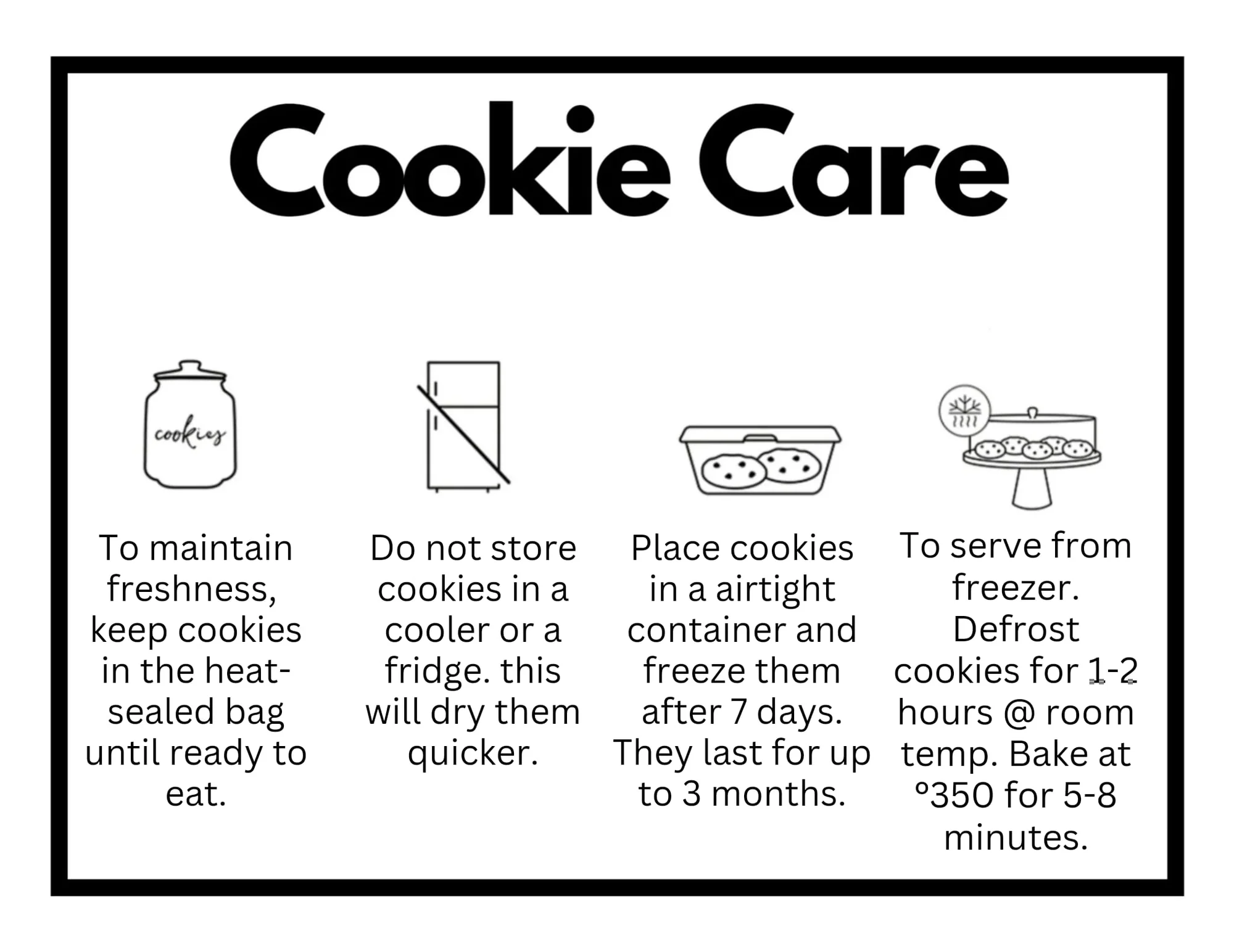 Cookies are made by hand using shared equipment, which processes dairy, peanuts, soy, tree nuts and wheat. if you have severe allergy, please know that while we do our best to prevent cross-contamination, WE ARE NOT an allergy-free bakery.
